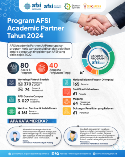 AFSI aktif dalam 129 kegiatan regulasi dan berhasil menginisiasi 29 perjanjian kerja sama dengan berbagai pihak, termasuk regulator dan pelaku industri, guna menciptakan kebijakan yang mendukung pertumbuhan fintech syariah.